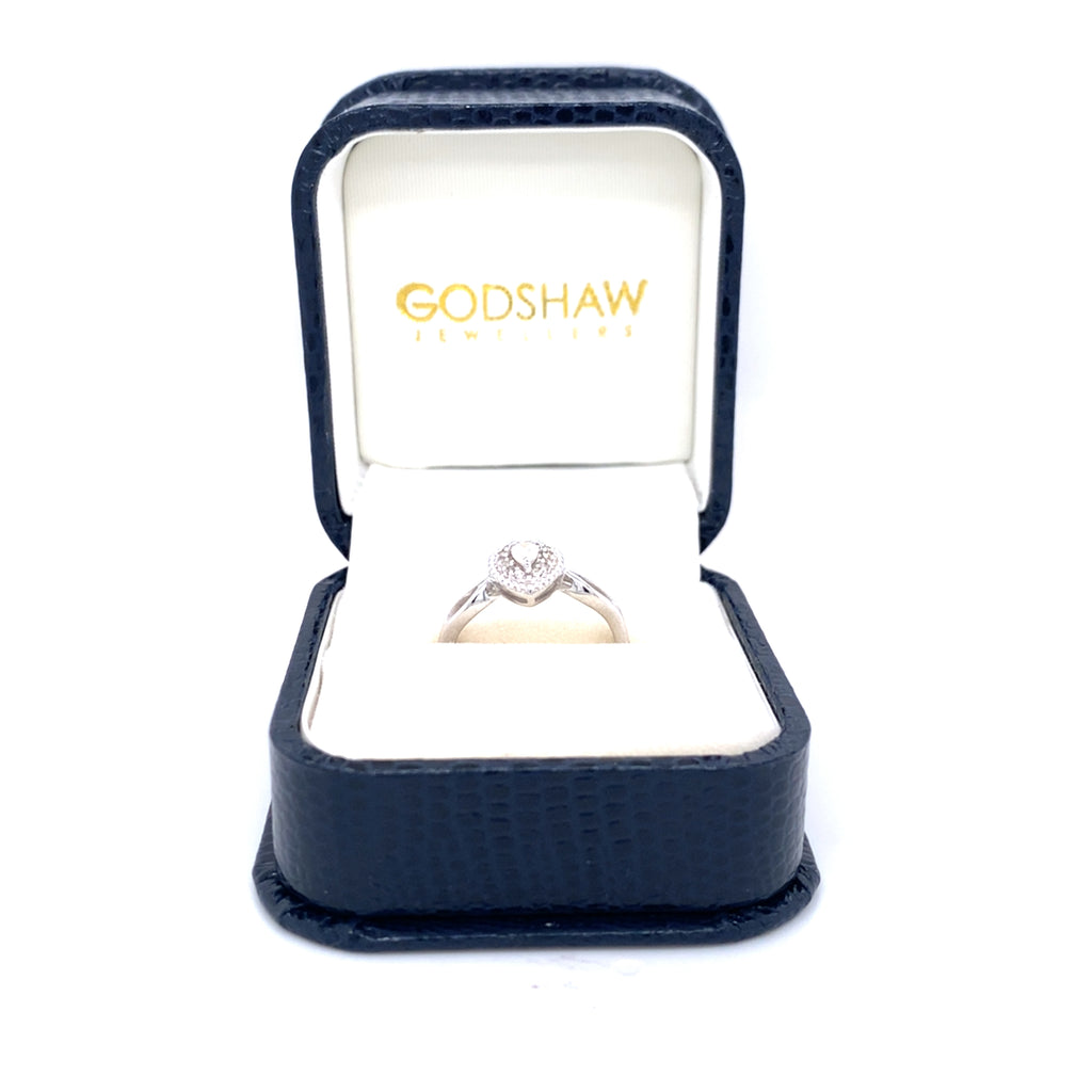 Pre-owned 9ct white gold (not hallmarked, stamped 375) cluster ring with central brilliant cut pear shape Diamond surrounded by 13 Diamonds. Wave design split shoulders.