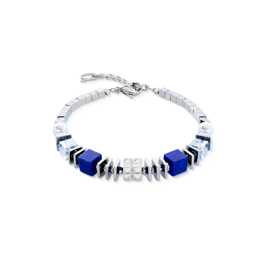 The Statement Cube Facets silver-blue bracelet balances geometric clarity with wearable sophistication. Lapis lazuli cubes, stainless steel square discs and the signature spike cube element create a distinctive visual rhythm.