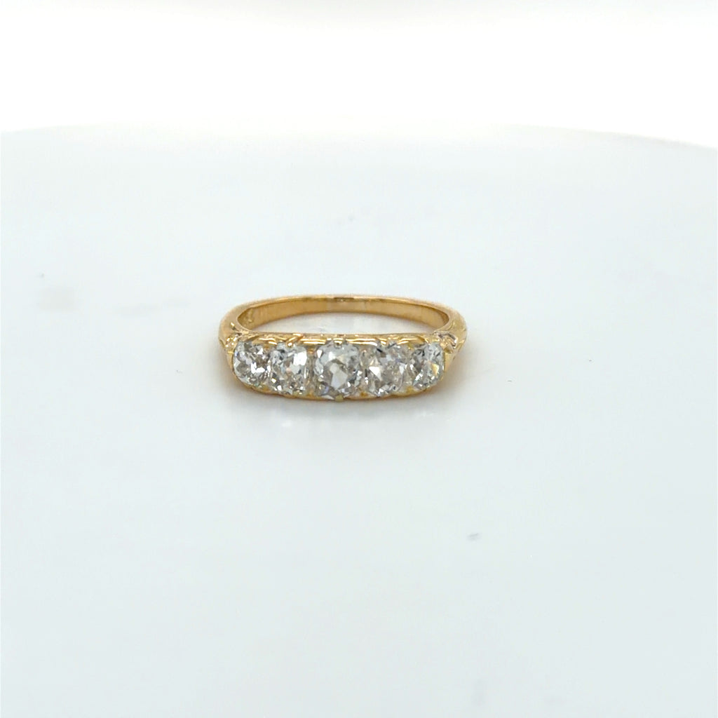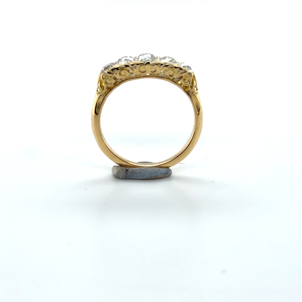 Pre-owned 18ct gold (stamped '18ct' only) late 19th century carved mount ring set with 5 old mine cut diamonds . Estimated weight of centre Diamond approx .40ct