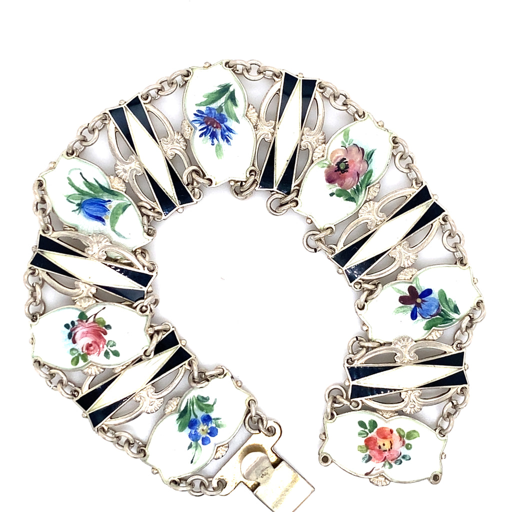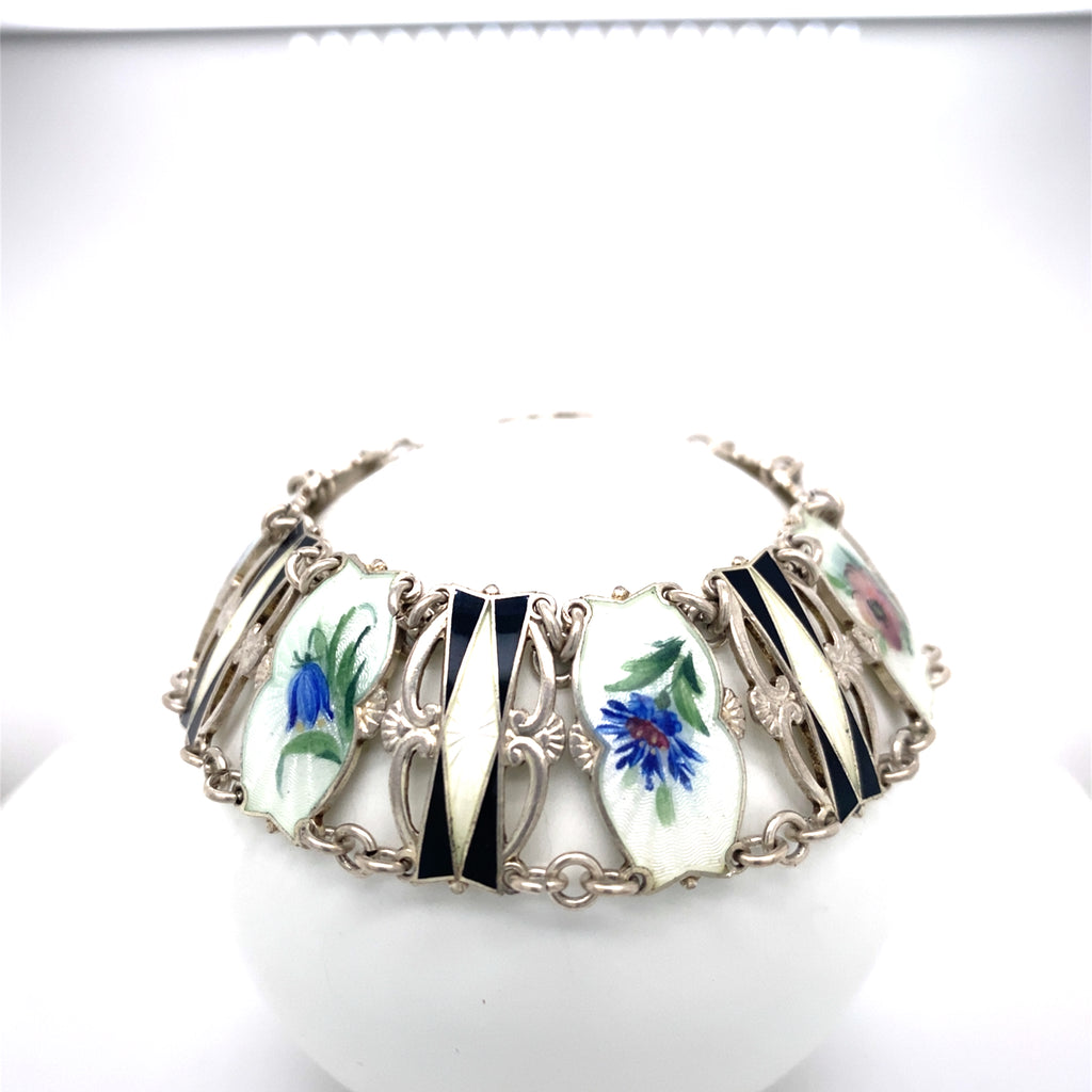 Pre-owned silver (stamped H 925 Sterling Norway) foliate enamel panel link bracelet.