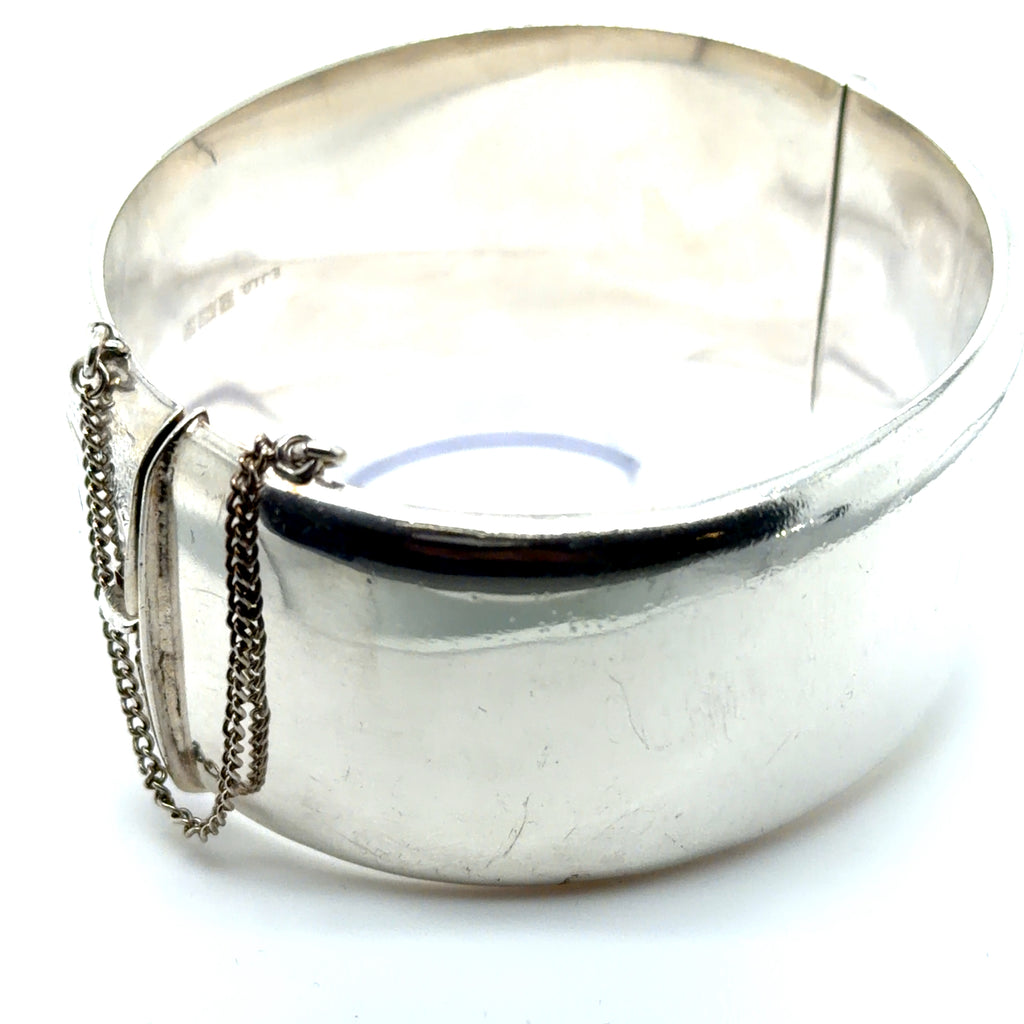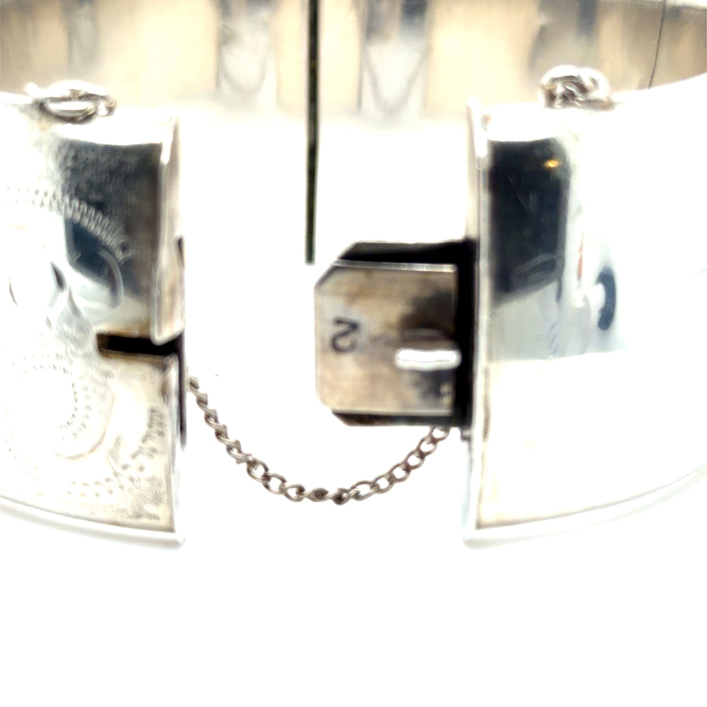 Pre-owned hallmarked silver (Birmingham 1972) silver half engraved hinged bangle. Fitted safety chain.